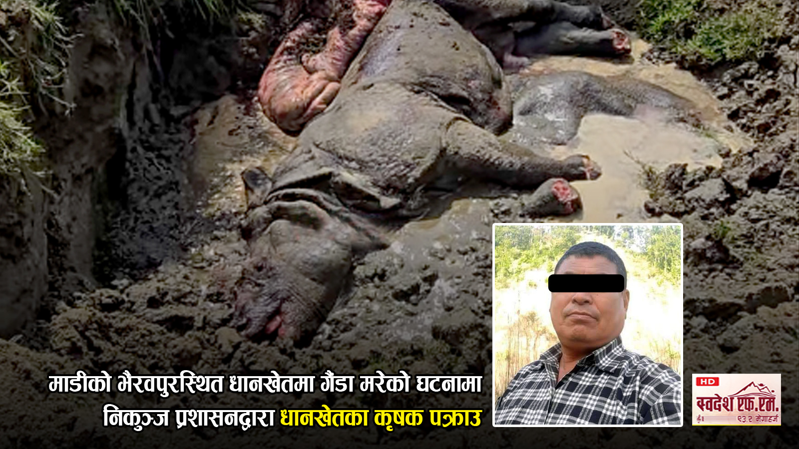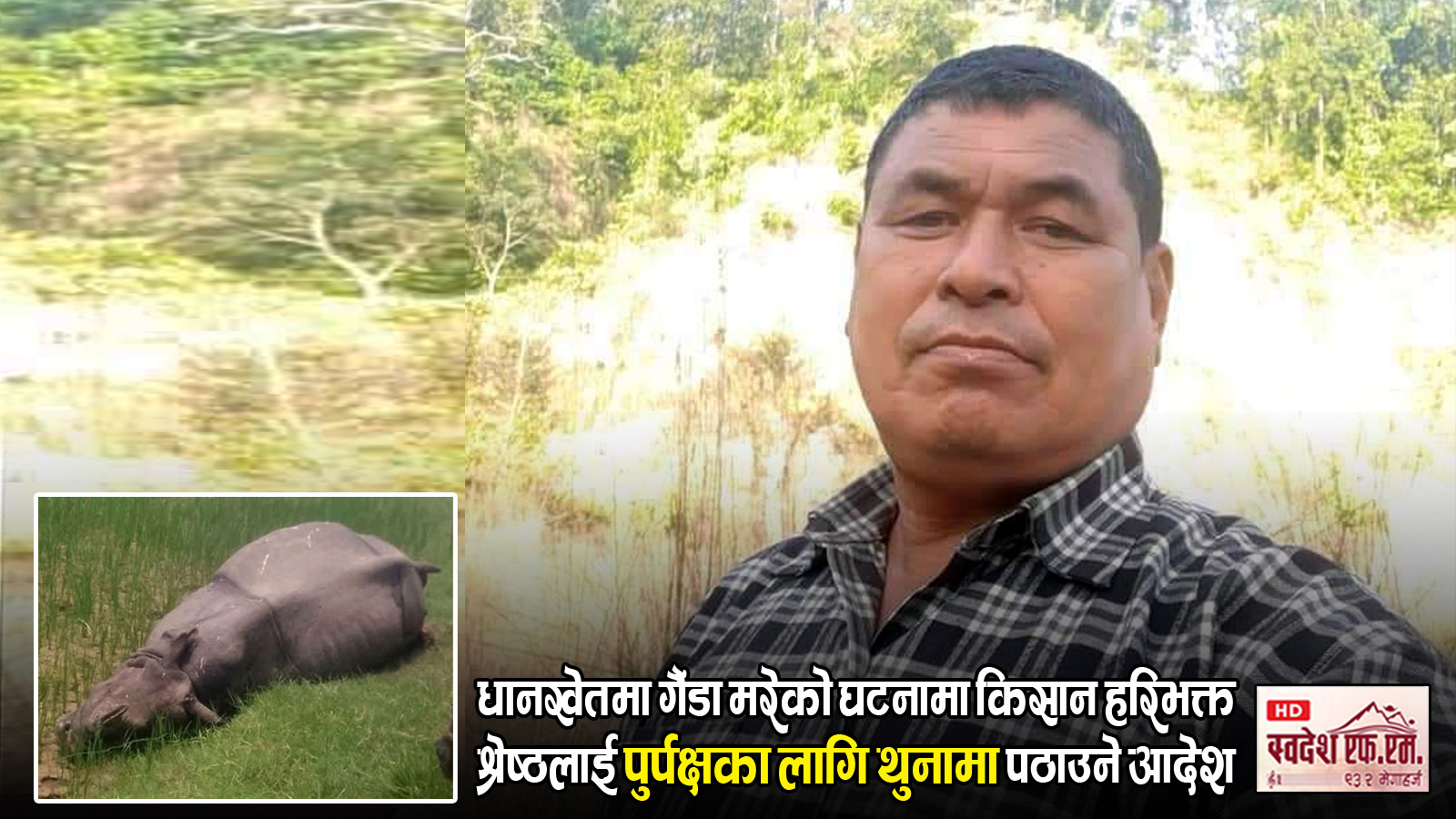 माडी, चितवन — माडीको भैरवपुर गाउँमा धानबाली जोगाउन खेतमा तारबार गरी करेन्ट प्रवाह गर्दा गैंडा मरेको घटनामा चितवन जिल्ला अदालतले किसान हरिभक्त श्रेष्ठलाई पुर्पक्षका लागि थुनामा पठाएको छ । धान खेतलाई जंगली जनावरबाट बचाउन खेत वरपर जि.आई. तारले घेराबार गरेका कृषक, माडी नगरपालिका-२, भैरवपुर निवासी श्रेष्ठलाई निकुञ्ज प्रशासनले पक्राउ...