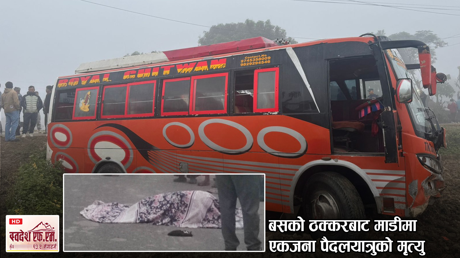६ मंसिर, माडी । माडीबाट भरतपुरका लागि छुटेको बसको ठक्करबाट माडी–१, गर्दी गाउँमा एकजना पैदलयात्रुको ज्यान गएको छ । बगहीँबाट भरतपुरका लागि छुटेको बागमती प्रदेश ०३ ००१ ख २८८७ नम्बरको बसको ठक्करबाट स्थानीयबासी, अन्दाजी ६० बर्षका फिरल महतोको घटनास्थलमै ज्यान गएको हो ।